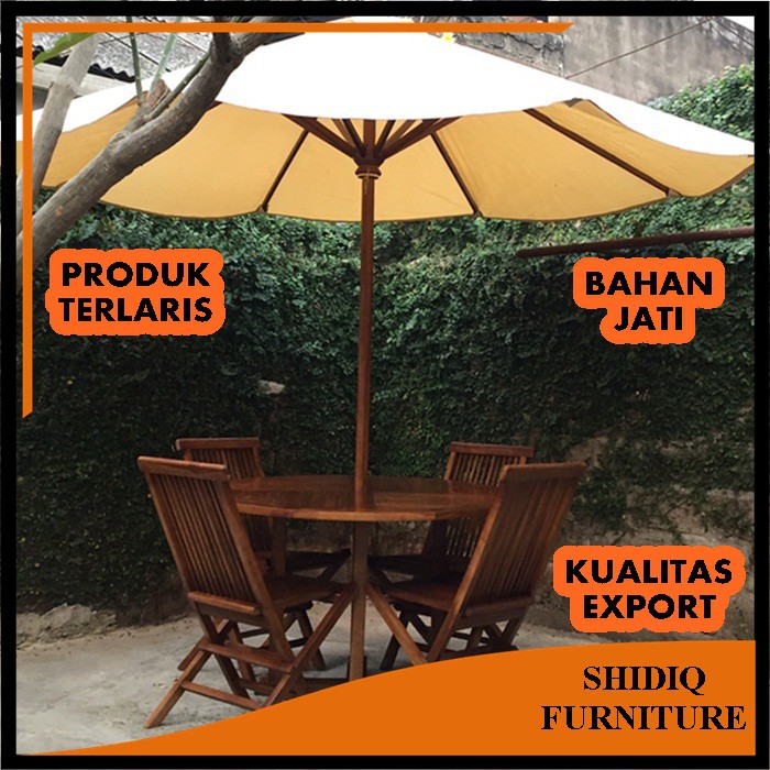 Payung Taman Outdoor Payung Tenda Bahan Kayu Jati Kualitas Ekspor Awet dan Taham LamaPRODUK TERLARISGARANSI PRODUK BARUKeterangan :- Payung saja = payung saja tanpa yang sudah difinishing tanpa kain - Payung+kain = dapat payung sekalian kainya, warna bebas sesuai pesanan- 1 set mentahan = lengkap sesuai gambar dapat 4 kursi, 1 meja dan 1 payung +kain hanya saja belum dikasih warna atau finishing- 1 set finishing = lengkap sesuai gambar dapat 4 kursi, 1 meja dan 1 payung +kain, dan sudah difinihsingDetail harga diatas :Bahan : Kayu Jati solidUkuran Meja : diameter 100 cmUkuran Payung : diamater 250 cmkursi : 4 kursi lipatkain : parasutJika anda berminat untuk memesan ukuran yang lebih besar dan kaulitas diatas standar bisa langsung chat kami.warna kain :- Hijau Daun- Merah Maroon- Merah Terang- Putih Cream- Biru- Kuning- Orange- Coklat- Hitambebas pilih warnaCatatan Sebelum Membeli:1. Pengiriman hanya dikenakan ongkir 1kg via JNE/J&T/SiCepat.2. Pelanggan dikenakan ongkir tambahan karena akan dikirim via cargo. Silahkan hubungi kami via chat untuk cek ongkir.3. Kami hanya akan mengirimkan catatan / faktur melalui JNE/J&T/SiCepat dsb.4. Barang fisik dikirim menggunakan kendaraan toko atau kargo lain - lebih murah dan aman.5. Resi diinfokan 2 – 3 hari kerja setelahnya, jika barang ready.6. Barang yang dijual adalah yang sesuai dengan nama dan deskripsi barang. Barang lain yang tampak di foto yang tidak sesuai dengan nama dan deskripsi hanyalah properti foto saja, tidak termasuk barang yang dijual.Dengan membeli barang ini, Anda menyetujui syarat di