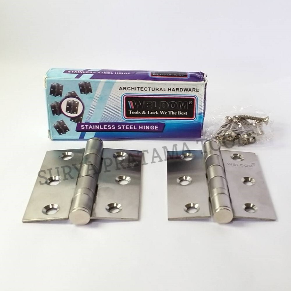 Engsel Stainless Steel 3" Merek WeldomUkuran 3 inch x 2,5 inch x 2 mmTebal 2 mmTermasuk skrupHarga diatas untuk 2 pcs (1 set)Digunakan untuk engsel pintu, jendela aluminium, dan pintu kayuHappy Shop