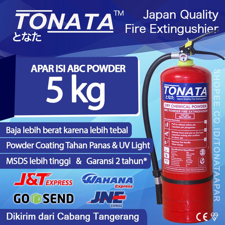 Ready Stock - TONATA ABC Powder APAR 5KG Set KomplitUkuran 5KG cocok untuk di ruangan sedang, dapur, dan kantor. Set komplit:1. Tabung APAR 5KG + ABC Powder 5KG + Nitrogen.2. Pressure gate3. Selang dalam4. Selang Luar5. Belt6. Leher tabung7. Fire Extingusher Holder (3KG)8. Safety tag9. Keterangan Refill10. Packing RapihIsi: ABC Powder. Cocok untuk api kelas A, B, dan C. Kelas A merupakan api yang berada pada benda padat, seperti kayu, kertas, dan plastik. Kelas B merupakan cairan mudah terbakar seperti minyak tanah, dan bensin. Kelas C merupakan api yang disebabkan oleh konslet listrik atau kabel. ABC powder aman untuk segala jenis barang padat, cairan, ataupun aliran listrik yang terbakar.MENGAPA BARANG APAR TONATA LEBIH BERAT: Dikarenakan lempengan baja kami lebih tebal mengakibatkan produk lebih berat. Isi powder, foam, dan CO2 juga sesuai dengan ukuran yang dibeli, karena kualitas TONATA nomor satu. Barang diproduksi langsung di Tangerang.Cara pemakaian APAR Tonata:- Tarik atau Lepas Pin pengunci tuas pada Tabung APAR.- Arahkan selang APAR ke titik pusat api..- Tekan tuas untuk mengeluarkan isi Tabung APAR- Kibaskan selang pada sumber api secara perlahan usahakan jangan melawan arah angin.GARANSI 2 TAHUN*1. Jika terjadi kerusakan / kebocoran pada produk dalam 2 minggu, kami akan mengganti produk yang baru. (TIDAK DIKENAKAN BIAYA APAPUN)2. Jika terjadi kerusakan pada tabung dalam 2 tahun, kami akan mengganti tabung baru. (DIKENAKAN BIAYA KIRIM SAJA)3. Prosedur DAMKAR Indonesia mengharuskan pergantian isi refill (CO2, Powder atau foam) 1 tahun sekaliNamun, jika kerusakan terjadi karena prilaku pembeli, kami tidak mempunyai kewajiban untuk mengganti pr