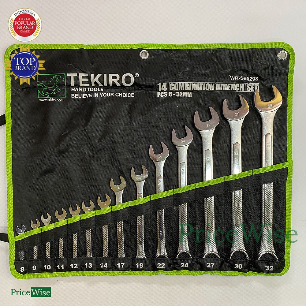 Merk: TekiroItem Code: WR-SE0298Isi: 14 buahUkuran: (8-32 mm)8 mm9 mm10 mm11 mm12 mm13 mm14 mm17 mm19 mm22 mm24 mm27 mm30 mm32 mmBahan: Chrome Vanadium (CrV), sehingga produk mengkilat, kuat dan tahan karat.Dropped forged and heat treated for extra strengthSilver Matt Finish Raised panel type provides added strengthJIS (Japan Industry Standard)Barang dijamin original Te