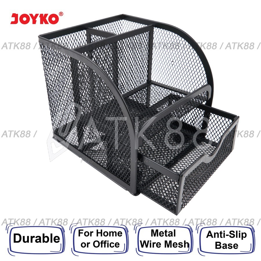 Desk Set Pen Holder Tempat Alat Tulis Jaring Jala Joyko DS-18>Product Size ( Ukuran Produk ) : Panjang 12.5 cm x Lebar 11.5 cm x Tinggi 11.3 cm>Color ( Warna ) : Black ( Hitam )>Material ( Bahan ) : Metal ( B